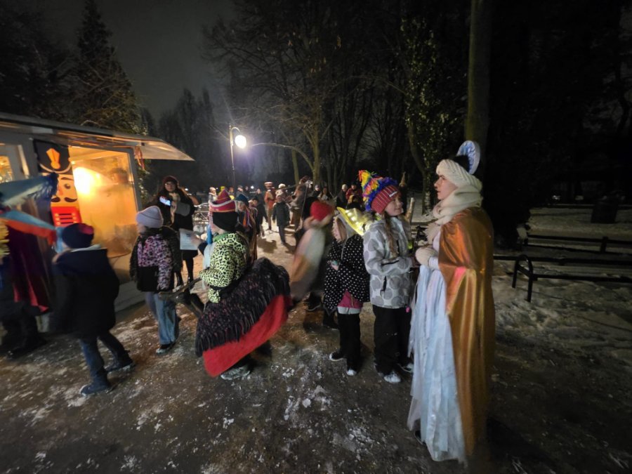 13.01 wyruszyliśmy Orszakiem Kolędniczym do restauracji „Umberto" poprzebierani tak, żeby ciężko nas było rozpoznać. Śpiewaliśmy wesołe pieśni, składaliśmy dobre życzenia a kozunia wyprosiła nam od gospodarzy okazały poczęstunek.