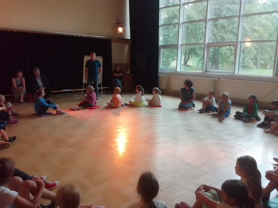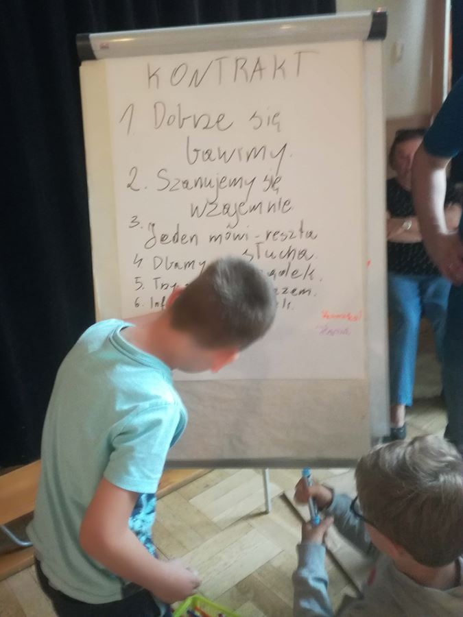 Przez cały dzień byliśmy w Domu Kultury, żeby się dobrze poznać. Stworzyliśmy wspólnie kontrakt, czyli zasady obowiązujące podczas półkolonii, które pozwolą nam spędzić czas w miłej atmosferze i przede wszystkim bezpiecznie. Po zajęciach integracyjnych, nauczyciele zaproponowali warsztaty artystyczne. Tworzyliśmy figurki z gliny, graliśmy na cymbałkach, odgrywaliśmy role w krótkich scenkach teatralnych, a do tego było dużo podskoków i tańców podczas zajęć umuzykalniających. Spotkaliśmy się z ratownikiem medycznym, który opowiedział o bezpieczeństwie podczas wakacji. Odwiedzili nas także policjanci, by porozmawiać o tym, jak zachować się w przestrzeni publicznej.