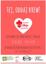 "Tej, oddaj krew!"Pod takim hasłem Związek Harcerstwa Polskiego, Regionalne Centrum Krwiodawstwa i Krwiolecznictwa w Poznaniu oraz Młodzieżowy Dom Kultury nr 2 zapraszają wszystkich chętnych do oddania krwi podczas akcji, która odbędzie się21 kwietnia 2018 r., w godz. 9:00-14:00w MDK nr 2 przy ul. Cytadelą 121.